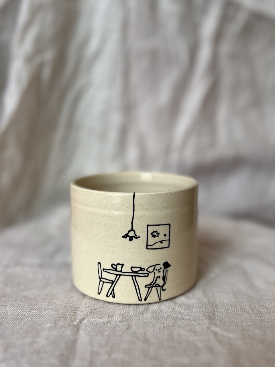 Kubek został wytoczony ręcznie oraz poszkliwiony szkliwem transparentnym. Ilustracja pieska stworzona przez MAZZAL Studio. Kubek można zmywać w zmywarce.
