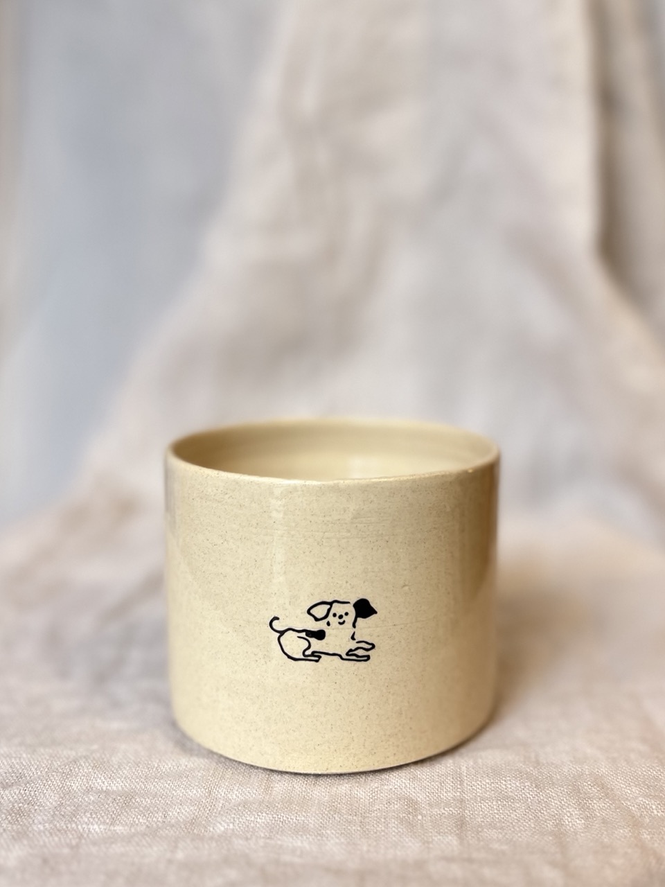 Kubek został wytoczony ręcznie oraz poszkliwiony szkliwem transparentnym. Ilustracja pieska stworzona przez MAZZAL Studio. Kubek można zmywać w zmywarce.