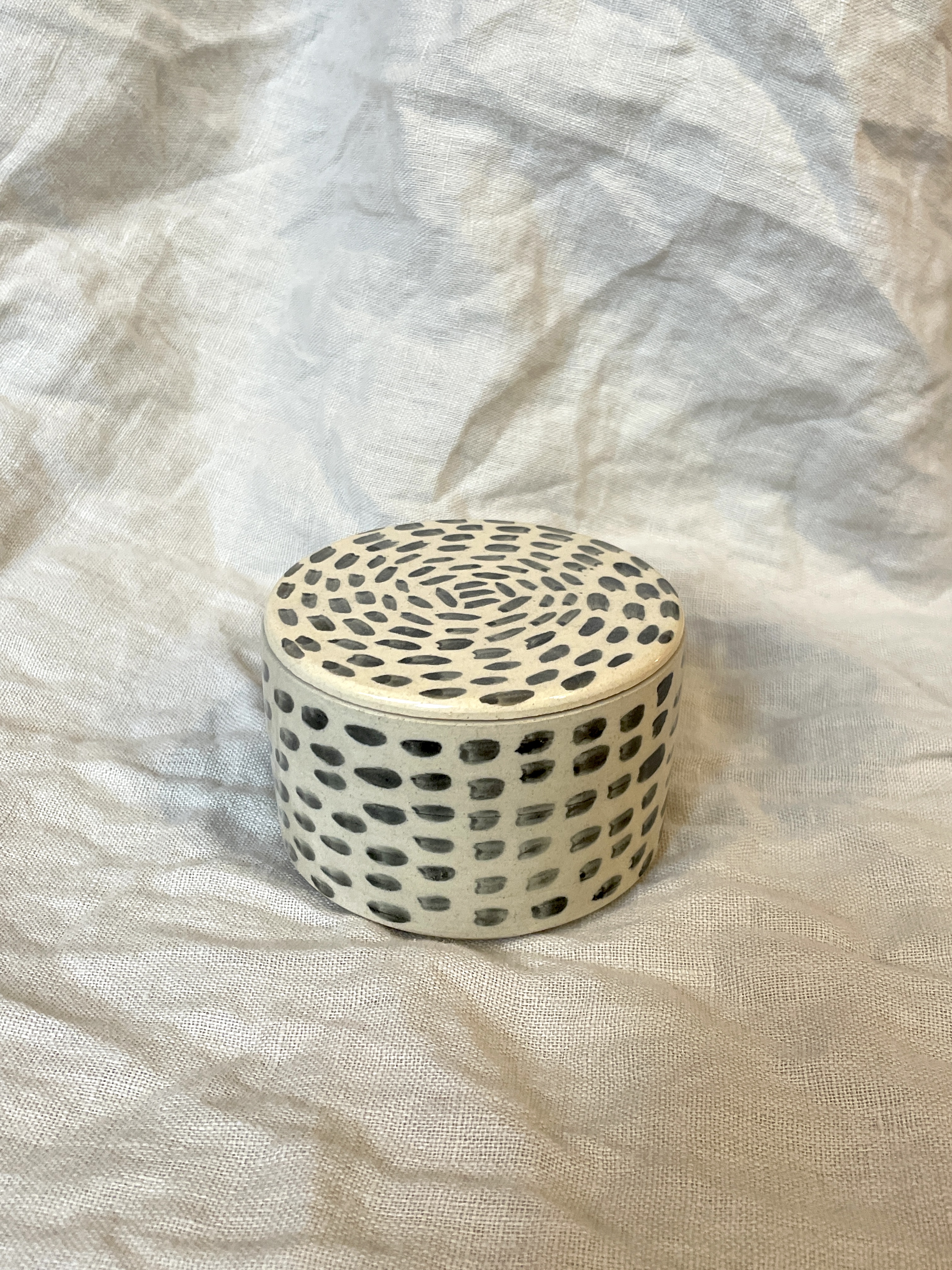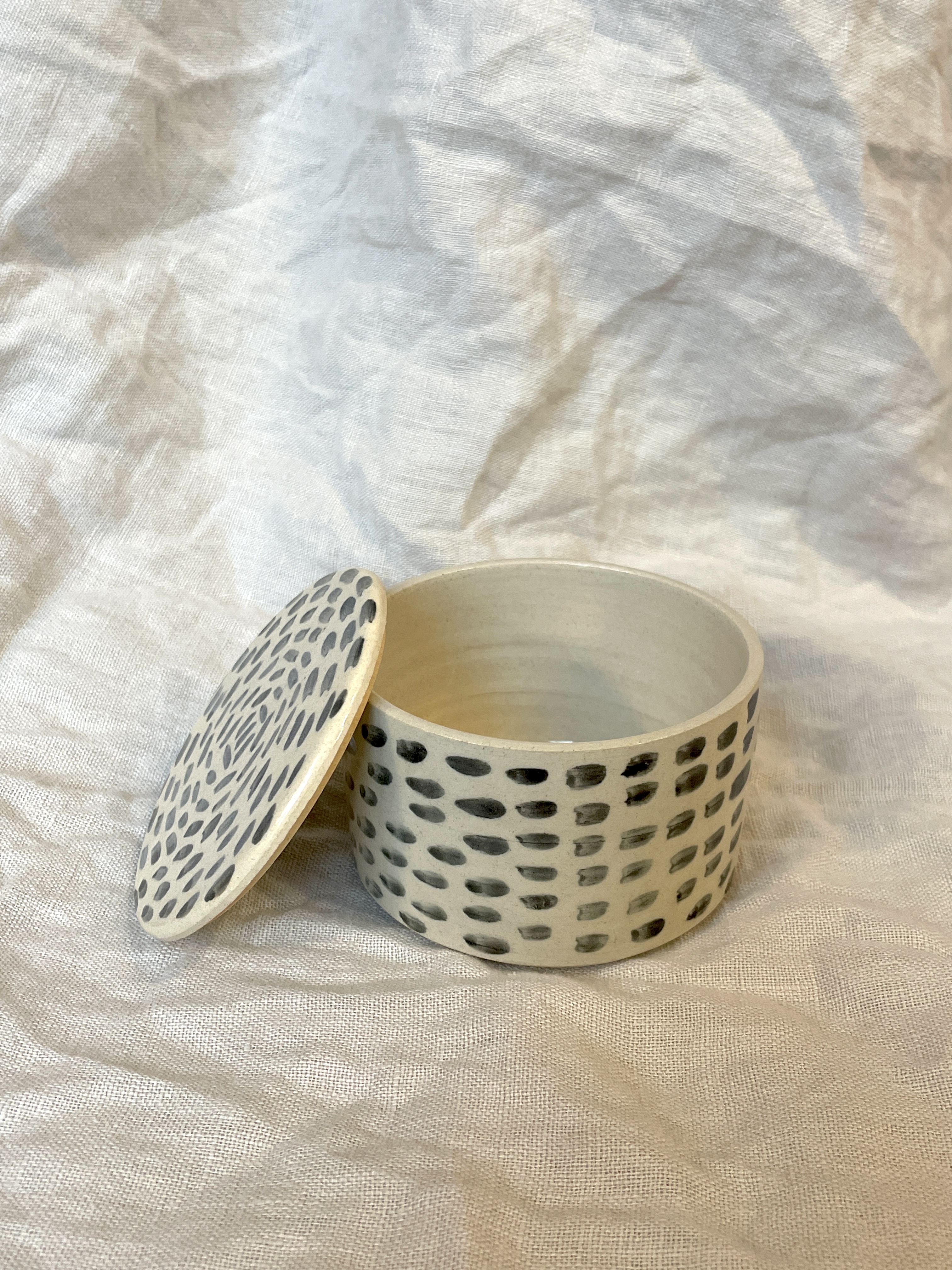 Puzderko w paski zostało wytoczone ręcznie oraz poszkliwione szkliwem transparentnym. Malowane ręcznie.